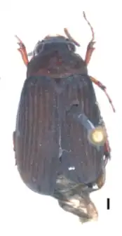 Adults reach a length of about 9.2 mm. Their body is oblong and reddish brown, with the ventral surface light reddish brown and the antenna yellow, while the dorsal surface is dull and glabrous.