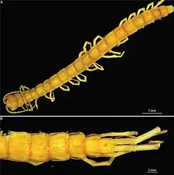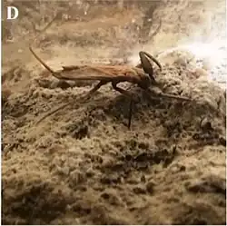 Movile cave was first discovered in 1986 by a team of workers looking for an appropriate spot to build a power plant.[2][3] Less than a hundred or so have actually been allowed inside the cave due to the number of hazards inside (lack of a natural opening, high levels of carbon dioxide and sulfur, hydrogen sulfide, etc.).[2][4] The cave also has very high humidity and temperatures, but also has very low levels of oxygen, with some of the deeper water levels in the cave being completely anoxic.[5] Despite these daunting conditions, the cave boasts very high levels of biodiversity, with dozens of species having been discovered, with about 75% only living in this system.[4] Nepa anophthalma was first described in 1994 based on eleven or so specimens, and at the time was one of twelve or so species known from the cave. The species name roughly translates to "without eyes", which is after this species lacking eyes due to its troglobitic ecology.[1]