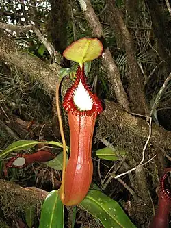 The pitcher base is bulbous to ovoid, with the pitcher cup becoming cylindrical in the upper two-thirds to three-quarters. The pitchers are some of the largest in the genus, sometimes exceeding 50 cm in height and 15 cm in width,[5] although they are usually around 30 cm high.[34] Wings at the front of the pitcher cup are either greatly reduced or absent altogether. On the inner surface of the pitcher, the glandular region is present in the bulbous portion. The mouth is elongated into a neck and has an oblique insertion. The peristome is cylindrical and up to 30 mm wide. It bears very highly developed teeth and ribs, the latter reaching 20 mm in diameter.[34] The pitcher lid or operculum is cordate, up to 8 cm wide,[27] and lacks appendages. An unbranched spur up to 20 mm long is inserted near the base of the lid.[5] Pitchers range in colour from light yellow to dark red.[34][35] The inner surface of the pitcher is usually white, contrasting sharply with the rich colouration of the outer surface. Most parts of the pitcher are very flexible, including the peristome ribs, with only the pitcher base, where the digestive zone is located, being rigid.[36][37]