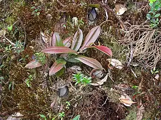 Nepenthes hamata may grow terrestrially or as an epiphyte. It is found in lower and upper montane mossy forest and among scrub vegetation on mountain ridges and summits. In such habitats it experiences high relative humidity and often partially shady conditions. It is known to occasionally form natural hybrids with N. glabrata and N. tentaculata.[4] The wild cross with N. glabrata was first reported by Ch'ien Lee in December 2006.[25]
