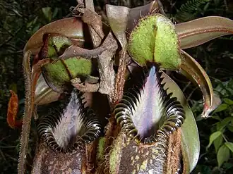 Rosette and lower pitchers are only produced for a short time before the plant transitions into a scrambling vine (although they may be produced later on offshoots from the original stem). They grow up to 18 cm high by 5 wide. They are ovate in the basal fifth to half of the pitcher cup, being bulbous to varying degrees in this portion,[4] often narrowly so.[7] The pitcher is narrower in the upper part and may be cylindrical or slightly infundibular towards the orifice. The boundary between these two portions is often delineated by a pronounced hip. The ventral face of the pitcher is flattened. A pair of wings up to 16 mm wide runs down the ventral surface of the pitcher cup. These wings bear densely packed filiform fringe elements up to 19 mm long, which commonly exceed the width of the wings themselves.[4] These filaments are often arranged in pairs, spaced around 2 mm apart, and are usually branched dichotomously once or twice.[7] The waxy zone of the inner surface is well developed.[24]