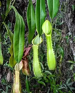 Nepenthes longiptera is a tropical pitcher plant endemic to the province of Aceh in the island of Sumatra in Indonesia. Nepenthes longiptera differs from all other Nepenthes species from Sumatra by the presence of wings on its upper pitchers. Morphologically, this species closely resembled N. tobaica, but differs on its much larger habit, the well-developed wings of its upper pitchers, the rhomboid-shaped cross-section of the stem, and the presence of appendage under the lid.[1]