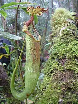 Nepenthes naga is a tropical pitcher plant endemic to the Barisan Mountains of Sumatra. It is characterised by a forked sub-apical appendage on the underside of the lid and an undulate lid margin.[2] The specific epithet naga is the Indonesian word for "dragon" and refers to the distinctive lid appendage of this species as well as the large size of its pitchers. The name also references local folklore, which tells of dragons occurring in this species's habitat in the past.[2]