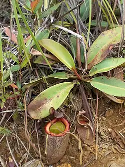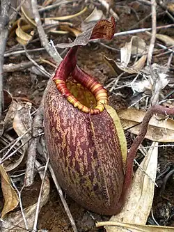 Rosette and lower pitchers vary widely in morphology, ranging from ellipsoidal to urceolate or entirely ovate. They are relatively large, growing to 28 cm in height by 16 cm in width. A pair of wings (≤10 mm wide), with fringe elements up to 9 mm long, runs down the ventral surface of the pitcher cup. The peristome is approximately cylindrical and up to 2 cm wide. It bears ribs up to 1.5 mm high and spaced up to 2 mm apart, which may terminate in teeth up to 1 mm long. The pitcher lid or operculum is ovate to elliptic in shape and measures up to 8 cm in length by 6 cm in width. A triangular basal crest is sometimes present on the underside of the lid together with scattered giant nectar glands measuring up to 3 mm across. An unbranched spur (≤12 mm long) is inserted near the base of the lid.[2]