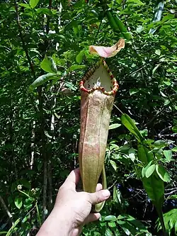 Upper pitchers are infundibular (funnel-shaped) throughout. They are by far the largest of the traps produced by this species, reaching 30 cm in height and 15 cm in width. As in many Nepenthes species, the wings are reduced to ribs in aerial pitchers. The mouth has a distinctive raised section at the front, a feature also exhibited by the related N. rafflesiana.[7]