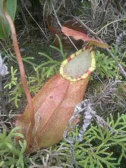 Lower pitchers are wholly ovoid, with the hip located just below the peristome. They grow to 20 cm high and 10 cm wide, and possess a pair of fringed wings up to 6 mm wide. The peristome is cylindrical in cross-section and up to 10 mm wide. The lid is orbiculate and, as in rosette pitchers, bears an unbranched spur.[7]