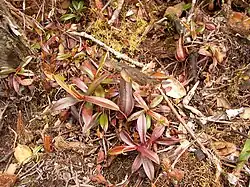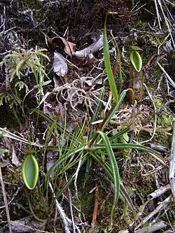 The species typically inhabits mossy forest, although it has also been recorded from ridge-top vegetation on mountain summits. Unlike many other Nepenthes species, N. tentaculata does not occur as an epiphyte; it always grows terrestrially.[19] Plants often grow in clumps of Sphagnum moss, spreading vegetatively via creeping subterranean stems.[20]