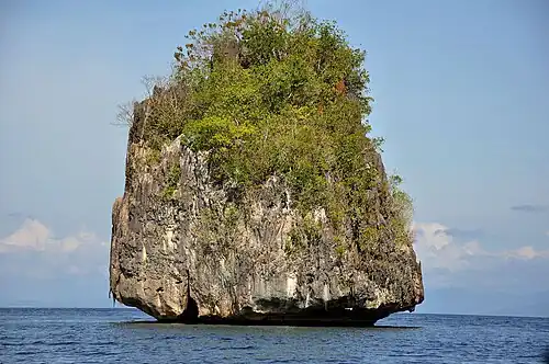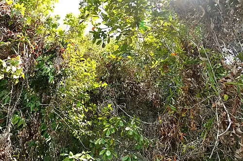 The tiny islets this species inhabits around Dinagat provide striking micro-habitats, often having near-vertical rock walls and highly vegetated tops. Here, N. viridis plants occasionally grow lithophytically,[1] their roots anchored in fissures.[7] Where present, surrounding vegetation provides support for the plants' scrambling vines, though these may overhang the sheer rock faces, dangling only a few metres from the water. Exposed to direct sunlight, the dark rock walls can get very hot, and during particularly dry periods any N. viridis plants in close proximity will largely wither, leaving only a few green shoots.[1]