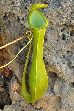 The leaves of climbing stems are similar, but are separated by longer internodes.[1] They are long and narrow, sometimes reaching almost three times the pitcher height, at least in plants from Samar.[12]