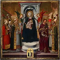On August 6, 1456, Neri di Bicci received a commission from Bartolomeo di Lucha Martini for an altarpiece of the Virgin and child with six saints. This commission has been identified with the painting now hanging in the chapel of St. James Cathedral in Seattle. It is one of the few works of Neri di Bicci in the United States. The painting underwent significant restoration at the Seattle Art Museum in 2004.[5] The St. James Cathedral altarpiece depicts the Virgin and Child in the center, flanked by saints: Luke, Bartholomew, and Lawrence on the left, John the Baptist, Martin, and Sebastian on the right. The bent arm of the infant Christ is unusual in Neri di Bicci's work—the nursing infant reaches into his mother's blouse, suggesting the Virgin lactans, or nursing Virgin.[6]