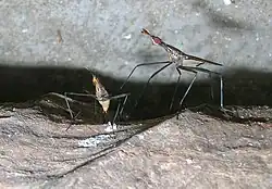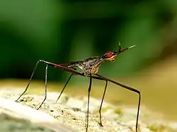 Most species of Neriidae are slender, long-legged flies. Many exhibit striped patterns that appear to provide camouflage against tree bark. Many neriids are sexually dimorphic, with males having more elongated bodies, heads, antennae, and legs than females. In some species, the male fore-tibia is greatly thickened distally. Neriid flies are saprophagous. Larvae develop in rotting vegetable matter, including bark and fruit. Neriid adults tend to aggregate on rotting vegetable matter or damaged tree trunks. Neriid adults are also attracted to flowers or other sources of sugar. The upper face has a medial division and the antennae are porrect. The arista on the antenna arises at the tip (not dorsally, as in the Micropezidae). The fore legs are long with prominent coxae. In the Micropezidae, the fore legs are reduced. The fore femora (and sometimes all femora) bear ventral spines in males. The fore tibia of males may have rows of spines or tubercles. The third and fourth veins of the wing converge at the tip and the first vein is not setulose.[14] Neriids have 1-5 frontal bristles, no ocellar bristles and some have reduced postvertical bristles.