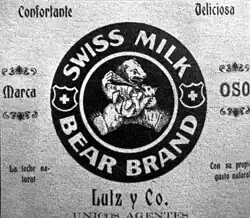 Bear Brand is a drink and powdered milk brand[3] currently owned by Nestlé.[4][5][6] The brand is available in most areas of Southeast Asia, East Asia, and Eastern Africa, as well as in Asian stores in the United States and Canada. It was marketed under the brand name "Marca Oso", which is Spanish for "Bear Brand".[7] The brand's Indonesian name is "Susu Cap Beruang".