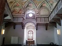 The chapel is the oldest newly built protestant church in the world, although construction of the shell began as a catholic court chapel in 1537, with a small apse, in which the altar with a crucifixion group, commissioned in 1540, is placed. In 1541 elector Otto Henry converted to the new Lutheran protestantism, and from 1542 the Salzburg church painter Hans Bocksberger der Ältere lavishly decorated the chapel with painted ceiling vaults and galleries in the latest antique-style Italian manner. The picture program not only thematized the decisive role of Christ as divine guarantor of grace, the central lutheran doctrine. It also claims a decisive role of the prince in the distribution of this grace within a God-given earthly order. The court chapel was consecrated on 25 April 1543 by the reformed theologian Andreas Osiander. It was thus the first newly built protestant church, an honor often attributed to the court chapel of Hartenfels Castle at Torgau which was built in 1443-44 and consecrated by Martin Luther on 5 October 1544.