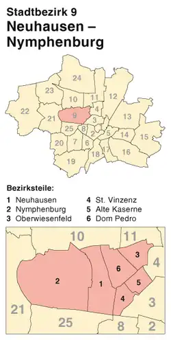 Neuhausen-Nymphenburg (German pronunciation: [nɔʏˈhaʊzn̩ ˈnʏmfnbʊʁk]) is a borough of Munich, the capital of the German state of Bavaria. It was created from the merger of the former boroughs of Neuhausen (Central Bavarian: Neihausn) and Nymphenburg in 1992.