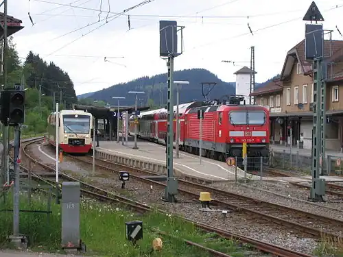 The Höllentalbahn was electrified from Freiburg to Neustadt in the 1930s. The system used had a voltage of 20,000 V at a frequency of 50 Hertz as Deutsche Reichsbahn wanted to investigate the suitability of mains power for railway operations. These experiments led to the development of the 25 kV AC electrification system, which is used in much of the world, but not in Germany. The electrical test operation began on 18 June 1936, with the construction costs amounting to 7 million Reichsmarks.[7] The eastern Höllentalbahn from Neustadt to Donaueschingen, however, was not electrified, so trains running from Freiburg to Donaueschingen had to change locomotives in Neustadt. For this purpose, the station received a three-road roundhouse for the servicing of electric locomotives. For the steam and diesel locomotives, there was a two-road (rectangular) engine shed. Three platform tracks were available for passenger services at an island platform and a "house" platform (next to the station building) after the Second World War.[8] On 20 May 1960, the Höllentalbahn was converted to the standard German electrification system (15 kV AC).[9] In the 1980s, the fireless locomotives used for the paper mill siding were taken out of service and replaced by diesel locomotives until the closure of the mill in 1988. One steam locomotive was scrapped, while the other is still available as an historical exhibit.[10] By the 1990s, the locomotive depot in Neustadt had become unnecessary because all rail services now terminated in Neustadt. The two engine sheds were then demolished.[11] The two mechanical interlockings were decommissioned in 1991. The station is now remotely controlled from the signal box in Titisee.[12][13]