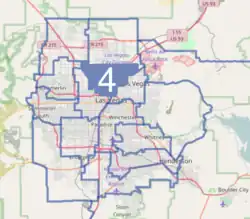 District 4 covers parts of North Las Vegas, Las Vegas, and Sunrise Manor in Clark County; it also includes North Las Vegas Airport.[3]