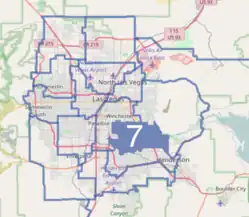 The present 7th district was drawn during the reapportionment of the districts in 2011 after the 2010 Census.[17] The newly drawn districts became effective for filing for office, and for nominating and electing senators on January 1, 2012, and for all other purposes on November 7 – the day after Election Day, when the new senator terms began. The area of District 7 is defined in the Nevada Revised Statutes using census tracts, block groups, and blocks.[18]