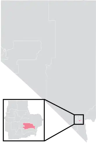 The district overlaps with Nevada's 1st and 3rd congressional districts, and with the 18th and 20th districts of the Nevada Assembly.[4] It has a surface area of 27 square miles (70 km2), and a perimeter of 31.5 miles (50.7 km).[5]