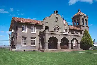 The design of the building is transitional between the older Mission Revival style and the newer Spanish Colonial Revival style. The building's Mission Revival elements are its arches and curved gable; Churrigueresque ornamentation at the side entrance shows Spanish Colonial Revival influence. The roof is tile and at the corner is a bell tower. At the time of construction, the belfry was in need of a set of bells; a single one is metal, but the rest are wooden dummies turned by the company. The building is fronted with a well maintained lawn along the east face.[5]