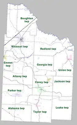 Townships in Arkansas are the divisions of a county. Each township includes unincorporated areas; some may have incorporated cities or towns within part of their boundaries. Arkansas townships have limited purposes in modern times. However, the United States census does list Arkansas population based on townships (sometimes referred to as "county subdivisions" or "minor civil divisions"). Townships are also of value for historical purposes in terms of genealogical research. Each town or city is within one or more townships in an Arkansas county based on census maps and publications. The townships of Nevada County are listed below; listed in parentheses are the cities, towns, and/or census-designated places that are fully or partially inside the township. [25][26]