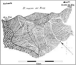 The Calchaqui River originates on Nevado de Acay and flows south,[15][16] as does the Rio Juramento.[17] Other waterbodies originating on Nevado de Acay are the Arroyo Pircas, a tributary to the Rio Juramento,[18] Arroyo Tastil which flows into Arroyo del Toro,[19] which also originates on Nevado de Acay and eventually flows into the Arroyo Arias;[20] Arroyo Arias in turn also drains into the Juramento.[21] Most streams in the area are fed with meltwater. The mountains form the drainage divide; water flowing to the west eventually ends up in various endorheic basins.[3] The Rio Los Patos also originates on Nevado de Acay and archeological sites are found on its river terraces,[22] and it converges with the Rio San Antonio de los Cobres, which likewise originates on Nevado de Acay as Rio Organullo and after passing close to San Antonio del los Cobres and receiving the Quebrada Potrerillos carries the name of the town, and eventually reach Salinas Grandes where they evaporate.[23]