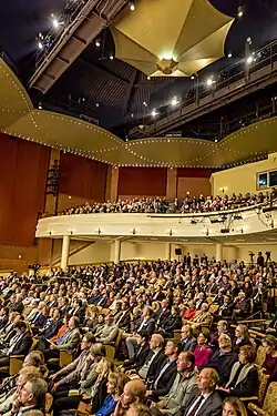 In 2004, the Foundation led the effort to build and endow a performing arts center in New Albany’s historic village center, the Jeanne B. McCoy Community Center for the Arts, adjacent to the public school campus.[25] The Foundation united the village and township governments, the school district, the community authority, and private benefactors, to create an arts venue serving both the schools and the community.[26][20] Playwright Wendy Wasserstein spoke at a 2004 fundraiser that raised $2.23 million for the future arts center. Moved by the community’s commitment to arts and education, Wasserstein said, "This is extraordinary… There is nothing like creating the strength of a community. It’s the most humane thing you can do."[27] The $13 million Jeanne B. McCoy Community Center for the Arts, known as "The McCoy," opened in 2008.[28] The center presents hundreds of events and performances annually, and is home to the 100-member New Albany Symphony Orchestra.[29] In 2019, The McCoy hosted a total of 374 events and welcomed 102,401 attendees, counting both students and community members.[1] The Foundation also established The McCoy's $7 million endowment.[9]