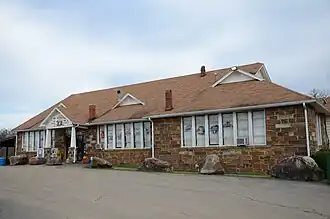 The New Blaine School is a historic school building at the junction of Arkansas Highway 22 and Spring Road in New Blaine, Arkansas. It is a single story masonry structure, built of coursed stone and covered by a complex gable-on-hip roof with triangular dormers. Its entrances are sheltered by Craftsman-style gabled porticos, supported by tapered square posts set on stone piers. It was built in 1925 by a local contractor to replace an older school.[2]