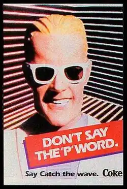 At the beginning of 1986, however, Coke's marketing team found a strategy by returning to one of their original motives for changing the formula: the youth market that preferred Pepsi. Max Headroom, the purportedly computer-generated media personality played by Matt Frewer, was chosen to replace Cosby as the spokesman for Coke's new "Catch the wave" campaign. With his slicked-back hair and sunglasses, he was already known to much of the U.S. youth audience through appearances on MTV and Cinemax. The campaign was launched with a television commercial produced by McCann Erickson New York, with Max saying in his trademark stutter, "C-c-c-catch the wave!" and referring to his fellow "Cokeologists".[24] In a riposte to Pepsi's televisual teasings, one showed Headroom asking a Pepsi can he was "interviewing" how it felt about more drinkers preferring Coke to it and then cut to the condensation forming on, and running down, the can. "S-s-s-s-sweating?" he asked.[25]