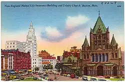 The New England Mutual Life Insurance Building is located near Boston's Copley Square. Construction began in 1939 and the building officially opened in 1941. The building land was purchased in 1937 from Massachusetts Institute of Technology (MIT), and was converted into an office building for the New England Mutual Life Insurance Company, a company later purchased by MetLife Inc. The land, before purchased by New England Mutual Life, was home to two MIT buildings on their originally established campus, the Rogers Building and the Walker Building. These two buildings were demolished to make way for the construction of this new office building. [1]