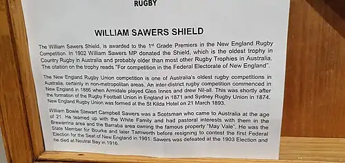 The Sawers Shield was donated by William Sawers MHR for the best team in Central North and New England Rugby Unions. Sawers was one of the few non-Armidale residents to hold a position on the NERFU committee. He was president of the Tamworth Rugby Club in 1896 and a vice-president of the NERFU. He was the inaugural member of the new New England electorate in the first Federal parliament.