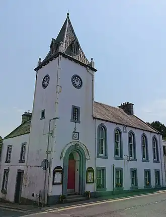 New Galloway Town Hall stands on the east side of the High Street, at a crossroads with East Port. It is a two-storey, five-bay building, with a square tower at its north end.[1] The tower has clock faces near the top, and a steep pyramid spire, with louvered lucarnes, and ball finials on each corner and the peak.[1][2][3]