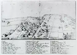 In all, the New Glarus settlers purchased 1,200 acres (500 hectares) for their new home.[10] Many of the pioneers were carpenters, mechanics, and farmers; trades that proved useful as the settlers prepared for their first winter in the Wisconsin Territory. A sum of $1,000 was used by the settlers that winter to purchase tools, cattle, seed, and other provisions, all of which had to be repaid with the price of the land within ten years of the formation of the colony.[7] Twelve families stayed in the community's only wooden hut that first winter, which was built on the same property where the Swiss United Church of Christ is presently located. Their diet consisted mainly of potatoes and grated cheese, a dish also known as Röschti. They also ate fish caught from the Little Sugar River. Bread, it was said, was a rarity, and meat even more so. To earn money to survive their first winter, the settlers worked in the nearby lead mines in Exeter and Mineral Point. In 1851 the first store in New Glarus opened, followed in 1853 by the first hotel, and in 1870 by the first cheese factory.
