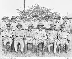 On 21 December 1939, Major Ross Field, a former officer in the Australian Imperial Force (AIF) and Director of Public Works at Rabaul, took over command of the unit.[11] A headquarters was subsequently established at Rabaul, while sub-units were located at Wau, Salamaua, Lae and Madang.[13] In the event of war the NGVR would be dispersed at strategic points on the mainland and the islands of the territory.[19] If mobilised, the NGVR would come under the operational command of the 8th Military District which was in the process of being raised under the command of Major General Basil Morris.[20] One of the unit's first tasks was to provide an armed escort for enemy aliens, mostly Germans and Austrians, who were being deported to Australia by ship to be interned. Contingents departed on 29 September 1939, 9 November 1939 and 31 May 1940, with each escort party consisting of a non-commissioned officer and six private soldiers.[21][22] Meanwhile, on 12 December the compulsory evacuation of all European women and children in Papua and New Guinea was ordered.[23] In June 1940 the NGVR's establishment was increased to 23 officers and 482 other ranks, although this proved difficult to achieve due to the demands of recruitment for overseas service with the Second Australian Imperial Force, which resulted in a large turn-over of men.[13][24] At this time contingency plans for the defence of Papua and New Guinea envisioned the deployment of Australian forces to Rabaul and Port Moresby, while the defence of Lae and Salamaua would be left to the NGVR.[23]