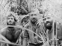 Ill-equipped and wearing an assortment of clothing and uniforms, their webbing was mostly of First World War vintage leather. Lacking helmets and entrenching tools, they carried packs and haversacks weighing in excess of 40 to 50 pounds (18 to 23 kg). With an average age of 35 years, most of the men had lived New Guinea for a considerable period of time. Highly individualistic and with limited military training, they lacked the coherence of a formed unit, while many brought their native labour lines with them to share the burden.[42] The men readied themselves to fight a guerrilla war from the hinterland against the expected invasion, as well as preparing to destroy key infrastructure to deny it to the Japanese. Meanwhile, another company formed at Lae under Captain Hugh Lyon for the same purpose. Both companies were ordered to commence a demolition campaign in the event of a Japanese landing, although Wau airfield was to be left intact for the time being.[43] NGVR personnel also helped rescue 217 survivors of Lark Force from Rabaul in February and March 1942.[44]