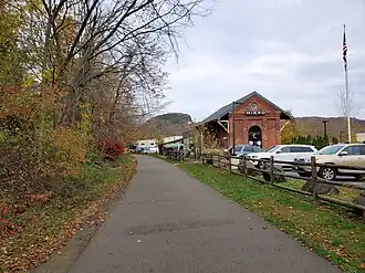 Farmington Canal Trail in October 2020, with the MiKro Depot restaurant in the former Mount Carmel freight house at center right