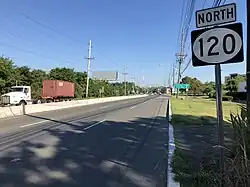Route 120 passes one of Meadowlands Racetrack's grandstands and parallels NJ Transit's Meadowlands Rail Line on the East Rutherford side of the road, while commercial and industrial development dominates the Carlstadt side of the road, intersecting with Gotham Parkway. The route has a southbound exit and entrance to the Meadowlands Sports Complex before it crosses Berrys Creek. Upon crossing the creek, Route 120 continues northwest through more commercial and industrial development, intersecting with Murray Hill Parkway towards East Rutherford and 20th Street towards Carlstadt.[2] A short distance past this intersection, the road becomes a four-lane undivided surface road that crosses over NJ Transit’s Pascack Valley Line before coming to an interchange with Route 17.[1][2] Here, Route 120 terminates and County Route 120 continues to the west as Paterson Avenue.[1]