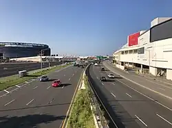 Route 120 begins at an interchange with the New Jersey Turnpike and Route 3, heading north-northeast on a six-lane freeway through the Meadowlands Sports Complex.[1] Here, MetLife Stadium, home field of the New York Giants and New York Jets of the National Football League, and the Meadowlands station at the terminus of NJ Transit's Meadowlands Rail Line is on the west side of the road, while the closed Meadowlands Arena and the American Dream shopping and entertainment complex are on the east side of the road.[2] There is an exit for an access road to the complex. The freeway comes to an end at an interchange where the road continues northeast into Moonachie as County Route 503 (Washington Avenue), while Route 120 exits onto Paterson Plank Road and heads northwest as a four-lane arterial road along the border of Carlstadt to the northeast and East Rutherford to the southwest.
