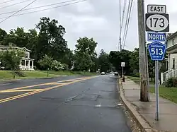 Route 173 follows Interstate 78/U.S. Route 22 for a little over a mile in Franklin Township until an interchange County Route 513 (Pittstown Road), where the eastbound direction merges onto this route and heads into Clinton. It meets the westbound direction of Route 173, which splits at this point and heads west on West Main Street to merge into westbound Interstate 78/U.S. Route 22 in Union Township.[1][3] In Clinton, Route 173 crosses over the South Branch Raritan River and splits from County Route 513 where that route heads north on Leigh Street.[1] The route crosses into Clinton Township and it features ramps connecting to Interstate 78/U.S. Route 22, with access from westbound Route 173 to westbound Interstate 78/U.S. Route 22 and from eastbound Interstate 78/U.S. Route 22 to eastbound Route 173.[1] Route 173 turns north to interchange with Route 31 and end at County Route 626 (Beaver Avenue).[1]