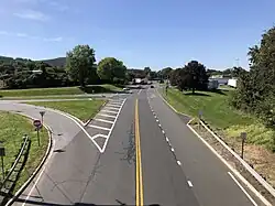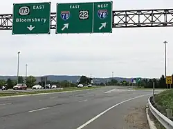 The route becomes a divided highway and meets County Route 614 (Little York Road) at a traffic circle near an interchange with Interstate 78/U.S. Route 22. Route 173 has direct ramps to and from the westbound direction of the interstate with access to and from the eastbound direction provided by way of County Route 614.[1] Route 173 narrows back to a two-lane, undivided road and closely follows Interstate 78/U.S. Route 22 to the north, meeting County Route 625 (Mechlin Corner Road) and County Route 635 (Charlestown Road) near another interchange with Interstate 78/U.S. Route 22. There is direct access to and from the westbound direction of Interstate 78/U.S. Route 22 while access to and from the eastbound direction of Interstate 78/U.S. Route 22 is provided by County Route 625.[1] The route continues east and splits into a one-way pair. At this point, eastbound Route 173 crosses over Interstate 78/U.S. Route 22 and makes a left turn to merge onto eastbound Interstate 78/U.S. Route 22. The westbound direction of Route 173 splits from Interstate 78/U.S. Route 22 and continues west to join back with eastbound Route 173.[1][3]