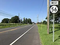 Route 56 is a state highway in the southern part of the U.S. state of New Jersey. Also known as Landis Avenue, it runs 9.19 mi (14.79 km) from an intersection with Route 77 and County Route 622 (CR 622) in Upper Deerfield Township, Cumberland County, to an intersection with Route 47 (Delsea Drive) in Vineland, Cumberland County. The route serves as a connector between Bridgeton and Vineland. West of the interchange with Route 55 in Vineland, Route 56 is a two-lane undivided road that passes through rural areas of Cumberland County, also entering a corner of Salem County. East of Route 55, the route is a four-lane locally maintained road that runs through commercial areas of Vineland.