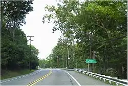 Past this intersection, the road heads northeast through farmland within the Pohatcong Creek valley, situated between Pohatcong Mountain to the south and Scotts Mountain to the north.[3] It enters Greenwich Township, where the route crosses County Route 637 (Liberty Road/North Main Street) before passing through residential areas. Route 57 heads into farmland with intermittent residences, crossing into Franklin Township. The route continues to New Village, where residences become more dense. A short distance after the intersection with County Route 633 (Edison Road), Route 57 heads back into farm fields. The road reaches the residential community of Broadway, where it comes to a junction with County Route 643 (Asbury Broadway Road). Route 57 continues through agricultural areas with more residences and businesses, crossing into Washington Township, where it intersects County Route 648 (Little Philadelphia Road) and County Route 623 (Brass Castle Road).[1][3]