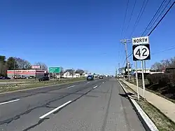 Route 42 begins at an intersection with US 322 and CR 536 Spur in Monroe Township, Gloucester County, where it heads to the north on the Black Horse Pike.[1] For the first portion of the route, Route 42 is a divided four–lane arterial highway that intersects various local roads. Some intersections along this section feature jughandles. There are also many businesses lining the highway.[3] The route crosses CR 689 (Berlin-Cross Keys Road) and enters Washington Township. It then intersects the northern terminus of CR 555 (Tuckahoe Road). After the intersection with CR 555, Route 42 intersects three more county routes: CR 655 (Fries Mill Road), CR 639 (Ganttown Road), and CR 651 (Greentree Road).[1] The route meets the western terminus of the Atlantic City Expressway at an interchange, Route 168 continues to the north on the Black Horse Pike, and Route 42 becomes the six–lane North–South Freeway.[1]