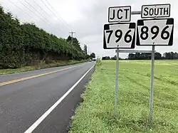 Pennsylvania Route 796, Pennsylvania Route 841 and Pennsylvania Route 896 are the numbered highways serving New London Township. PA 896 follows Newark Road along a northwest–southeast alignment across the northern and eastern portions of the township. PA 841 follows Chesterville Road along a southwest–northeast alignment across the southern portion of the township. Finally, PA 796 starts at PA 896 and heads northward along Jennersville Road in the northern portion of the township.