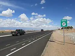 New Mexico State Road 47 (NM 47) is a 60.338-mile-long (97.105 km) state highway in Bernalillo, Valencia, and Socorro Counties in New Mexico. NM 47's southern terminus is at an intersection with U.S. Route 60 (US 60). The highway then proceeds north intersecting with Interstate 25 (I-25) before the northern terminus at an intersection with NM 556.