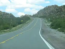 8 miles from the Arizona border, NM 80 intersects the eastern terminus of NM 533. Four miles north of NM 533 is the western terminus of NM 9, which heads east to Animas and Columbus.[4] Continuing north, NM 80 passes Rodeo Airport, then curves northeast, skirting the base of both Granite Peak and Blue Mountain.[2] At the eastern base of Blue Mountain is the western terminus of NM 143.[4] NM 80 then makes a straight shot north through a desolate flat desert landscape until it reaches Roadforks. The small unincorporated area has a few service stations and small businesses for both NM 80 and I-10 travelers.[2] NM 80 continues for a few hundred feet north, before ending in a trumpet interchange at I-10 Exit 5.[1][2] While NM 80 ends here, US 80 would have continued east along much of the current route of I-10 to the Texas border.[3]