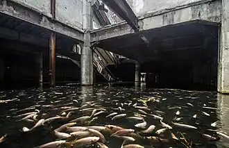 In 2011, the existence of the fish pond in the abandoned mall began to gain attention online, drawing visitors and urban explorers.[9][10] Their numbers surged in 2014 after photographs of the site went viral online and became noticed by the media.[7][2] This prompted the BMA to bar entry to the site over safety concerns; it later had the fish removed and the water drained in 2015.[11][8]