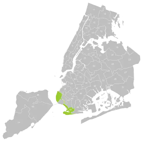 The district overlaps with Brooklyn Community Boards 10, 11, 13, and 15, and with New York's 8th, 10th, and 11th congressional districts. It also overlaps with the 17th, 23rd, and 26th districts of the New York State Senate, and with the 45th, 46th, 47th, 49th, 51st and 64th districts of the New York State Assembly.[4]