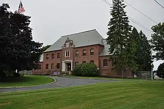 The NYS Armory is a historic former National Guard armory building located at Ticonderoga in Essex County, New York. It was built in 1934–1935 and is a large, two story T-shaped brick and case stone building with Tudor and Jacobean Revival style features. The main seven bay block has a steeply pitched, slate-covered hipped roof and is flanked by two bay wings.[2]