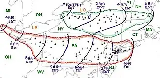 As the Syracuse Derecho moved into New England, a new derecho started developing in southeastern Michigan at around 4 A.M. EDT and followed a track just to the south of the first one. The derecho raced through northeastern Ohio and Pennsylvania, New Jersey and ended up in New York in the mid-afternoon hours.[2]