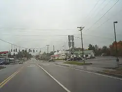The Nicholville–Lawrenceville segment of NY 2A was concurrent with NY 56, another route assigned in the mid-1920s that extended from Massena in the northwest to Meacham Lake in the southeast via Winthrop and Saint Regis Falls.[6][7] When NY 2 was redesignated as U.S. Route 11 in 1927, the NY 2A designation was eliminated and replaced with a realigned NY 56 from Potsdam to Nicholville.[8] NY 56 was truncated to end in Potsdam as part of the change.[9] In the 1930 renumbering of state highways in New York, NY 56 was renumbered to NY 72 while NY 11B was assigned to the pre-1927 routing of NY 56 between Nicholville and Lawrenceville.[2] At the same time, a connector between NY 11B in Nicholville and U.S. Route 11 in North Bangor by way of Bangor was designated NY 187.[10] NY 11B was extended westward to Potsdam by the following year, creating a lengthy overlap with NY 72.[11]